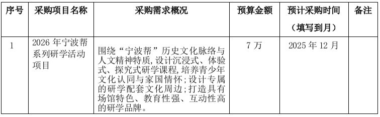 为便于供应商及时了解政府采购信息,根据《财政部关于开展政府采购意向公开工作的通知》(财库〔2020〕10号)等有关规定,现将宁波博物院2025年12月 如下: