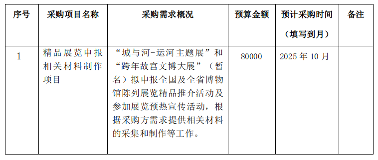 为便于供应商及时了解政府采购信息,根据《财政部关于开展政府采购意向公开工作的通知》(财库〔2020〕10号)等有关规定,现将宁波博物院2025年9月采购意向公开 如下: