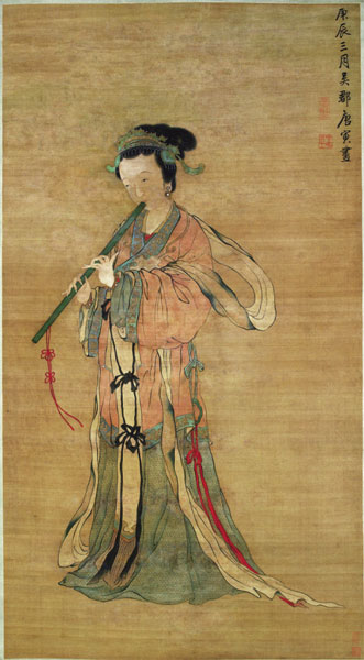 吹箫仕女图轴 唐寅人物画早年多为工笔,晚年趋写意。本幅为工笔重彩画法,风格细劲浓艳,承唐宋人物画传统,细节描绘尤为仔细。