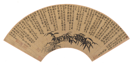 墨竹图扇页 唐寅52岁时所作。图中寥寥数笔,便将几丛竹叶写得生动而自然。风竹摇曳,与上方密密匝匝的小楷诗文正相呼应。
