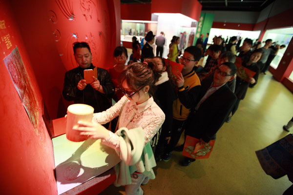 春节期间,宁波博物馆共有三大主要展览。《“福满甬城”——故宫博物馆藏福文化珍宝展》、《意匠华夏——中国古建筑经典模型展》、《瓶壁生辉——中国历代壁瓶精品展》,其中又以“福满甬城”最受青睐。整个展馆充满了吉祥如意的过年气氛,很多游客一进展厅,都要率先去摸摸入口那个正红色的“福”字镂空雕花壁窗。一位抱着孩子的爸爸,说着“这叫摸福,摸了之后,一年的福气就好啦。”,一边让孩子去摸福。