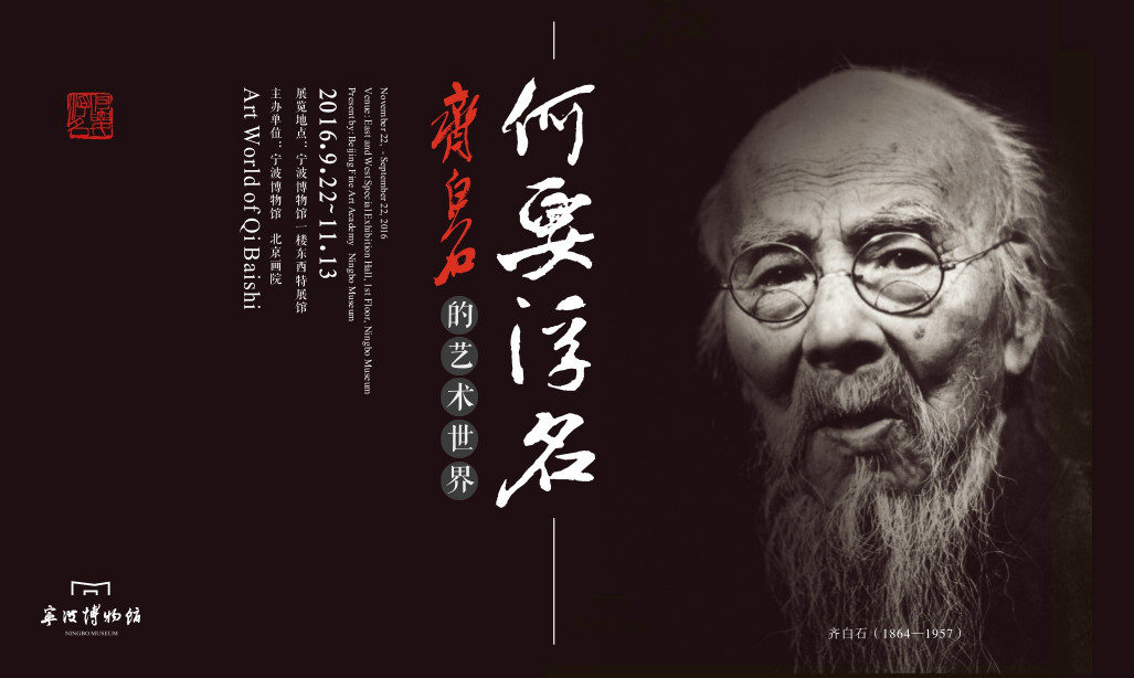 2016年9月22日,齐白石艺术系列展“何要浮名—齐白石艺术世界”展览在宁波博物馆一楼临展厅隆重开展。此次展览由宁波博物馆、北京画院联合主办,从北京画院精选150幅齐白石作品,是近年来在宁波、在浙江、乃至整个中国南方唯一称得上“三最”—数量最多、价值最高、品类最广的齐白石作品展。展览持续至11月13日。 齐白石(1864——1957),原名纯芝,号渭青、兰亭,后改名璜,号濒生,别号白石、白石老人,湖南湘潭人。二十世纪中国画坛最负盛名、影响力和创作力的国画大师,书法、篆刻家和诗人,北京中国画院名誉院长,“人民艺术家”,世界和平理事会“国际和平奖金”获得者、“世界文化名人”。 齐白石的一生,视艺术为“寂寞之道”,他突破传统,“画前人所未画,发前人所未发”,从行“衰年变法”创“红花墨叶”,取“不似之似”为“百鸟传神”,到守“寂寞之道”终得“天然之趣”,他以自身半个多世纪的艺术实践,在中国千年绘画历史长河中建构起了属于自己的艺术体系,独创一格。他以赤子之心对自然、生命真情讴歌与礼赞,将世俗情趣融入文人情怀,为传统文化注入时代精神,极大地拓展了中国绘画的创作题材。他的艺术,在中国传统绘画的现当代转型中发挥着重要作用,对二十世纪中国画发展产生深远影响。 北京画院是收藏齐白石艺术作品数量最多的机构,艺术体系完整。宁波博物馆特邀北京画院共同策划,合力推出“何要浮名——齐白石的艺术世界”特展,展览以齐白石晚年印语“何要浮名”为主题,共分“星塘白屋不出公卿”、“要知天道酬勤”、“知己有恩”、“寂寞之道”、“ 三百石印富翁”五大板块,全面呈现齐白石的人生经历、性格情感与艺术发展脉络,还原齐白石艺术的形成轨迹与特色,探索齐白石作品背后所蕴含的“天然之趣”。 为了增强观众欣赏、研究齐白石艺术作品体验感,此次特展宁波博物馆特采用视频导览技术,增添“扫一扫”语音讲解导览功能。希冀通过此次特展,观众能重温经典、感悟新知,体味二十世纪中国画发展与变革浪潮中的波澜壮阔,感受中国传统文化的底蕴与魅力。