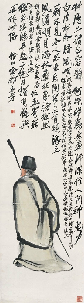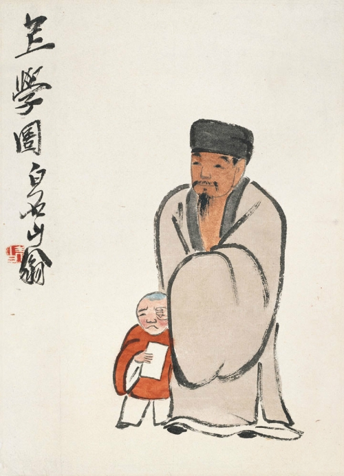 相关作品链接: 上学图 镜心 纸本设色 纵34.5厘米 横25.0厘米 无年款 北京画院藏 【题款】上学图。白石山翁。 【钤印】老白(白文) 这是一幅极富生活情趣的作品,它将祖孙二人迥然的神态及二者之间的浓浓亲情很好地表达了出来。画面构图简洁,仅一老一少。老者身着宽松长袍,戴一黑帽,眉目间透露着一股安静祥和的神态。少者身穿红色长褂,手拿一书,左手因啜泣而拭泪,正是孩童既委屈又撒娇的模样。作者以看似随意的几笔勾勒出了人物的轮廓线条,再以墨、色加以晕染,老者略深的肤色和孩童粉白的脸颊互为映衬,而孩童红色的小褂,则让画面有了一种明艳、活泼的感觉。画面左侧题写:“上学图。白石山翁”,点明了作品的主题。这是件表现爷爷送孙儿上学时情景的作品。白石老人为何要画这样一幅作品?据《白石老人自述》记载,齐白石四岁时便跟随祖父识字,七岁那年,祖父已将自己所认识的字全都教给了小阿芝,再无可教,因无钱能供孙儿上学,只能频频叹气。齐母得知此事,便将积攒下的稻谷换了钱,在齐白石八岁那年,送他去公开的蒙馆读书。每天清早,祖父都会送齐白石去学堂,傍晚再接回家。三里地的路程虽说不远,却走的是黄泥路。每逢下雨便泥泞不堪,这时祖父总是一手撑着雨伞,一手提着饭箩,看准了脚步,扶着小阿芝走。有时泥塘深了,就把孙儿背起,低着头一直往前走,累得气都喘不过来。这幅《上学图》不仅是齐白石对儿时上学念书的回忆,更是对祖孙情谊的深深追思。画面虽然没有布景,仅通过人物之间的动作与神态,却给人以前有学堂,后有人家的空间想象。 寻旧图 轴 纸本设色 纵 151.5厘米 横 42.0 厘米 无年款 北京画院藏 【题款】草庐三请不容辞,何况雕虫老画师。深信人间神鬼力,白皮松外暗风吹(戊辰秋,徐君悲鸿为旧京艺术院长,欲聘余为教授,三过借山馆,余始应其请。徐君考试诸生,其画题曰:白皮松。考试毕,商余以定甲乙,余所论取,徐君从之。)一朝不见令人思,重聚陶然未有期。海上风清明月满,杖藜扶梦访徐熙(徐君辞燕时,余问南归何处?答云:月缺在南京,月满在上海)。作画寄赠徐君悲鸿并题二绝句,犹有余兴,再作此幅,借山吟馆主者。 【钤印】木居士(白文) 白石翁(白文) 甑屋(朱文) 《寻旧图》在齐白石人物画中有着特殊的地位,齐白石一生极少画自画像,而《寻旧图》就是其中之一。齐白石画这件作品并不是为了画他自己,而是对于友人徐悲鸿以及旧事的回忆。齐白石与徐悲鸿有约25年的友谊,可以说徐悲鸿是齐白石继陈师曾之后的知己,二人不仅在艺术上和而不同、相互切磋,而且在生活上也相互扶助。两位艺术家相识于徐悲鸿去北京赴职北平大学艺术学院院长期间,1928年,徐悲鸿三顾茅庐请齐白石任教于学院,《寻旧图》这件作品中的题跋就记述了这件事情的始末。 徐悲鸿虽然是从法国学习西画出身,但是他十分欣赏齐白石的作品。他自己有丰富的齐白石作品收藏,而且还推荐自己的朋友来收藏齐白石的作品。徐悲鸿曾经将齐白石的作品带到欧洲、南洋等地巡展,而且还为齐白石出版画集。在《白石画集》题跋中齐白石写道:“从来画山水者,惟大涤子能变。吾亦变。时人不加称许,正与大涤子同。独悲鸿心折,此册乃悲鸿为办印,故山水特多。安得悲鸿化身万亿,吾之山水画传矣。普天下人不独只知石涛也。”齐白石和徐悲鸿还曾经合作过作品,如此深切的艺术交流是两人友谊的基础。在生活上徐悲鸿十分关心齐白石。新中国成立以后,齐白石所在的中央美院在华大三部并入后人事变动较大,有人提出了停聘教课较少的教员,这其中就包含了齐白石。而徐悲鸿以齐白石每月交作品的变通方式,坚持聘请齐白石并且保证他的薪水。 齐白石与徐悲鸿两人的忘年交是中国艺坛上的一段佳话,怪不得在徐悲鸿南下以后,齐白石思念徐悲鸿日切,并画下此作,一句“一朝不见令人思,重聚陶然未有期”道尽齐白石对徐悲鸿的想念。 小 虾 镜芯 纸本墨笔 纵 26.0 厘米 横 26.0厘米 无年款 北京画院藏 【题款】此小虾乃予老眼写生。当不卖钱。 在北京画院所收藏的数十件齐白石画“虾”的作品中,这幅纵横皆只有26厘米的小画儿,的确是个特例。称其特别,理由有二:其一,这幅《小虾》应是齐白石的一幅写生作品,以工笔方式一丝不苟地描摹对象而成,其状可比“工笔草虫”诸作那份“尽精微”的状态。从用笔的谨小慎微以及虾的形象与齐白石成熟期那些“胆敢独造”的虾相比较,无论笔法还是形象,可谓大相径庭。倒是和北京画院所藏的齐白石老师胡沁园的一幅“戏笔”之虾从状貌上有些相似。因此,应视为齐白石画虾存世作品中的特例。其二,此作右侧用一张纸题写“此小虾乃予老眼写生,当不卖钱”与画作装裱在一处,又可引发两个问题。首先,两张纸颜色不同,画作的纸深一些,题字的纸浅一些,恐怕是后题而装裱在一处的,可见齐白石对此幅先前画的小虾的重视。其次,“此小虾乃予老眼写生,当不卖钱”的题跋,明明白白表达了白石老人的心意。核心是“老眼写生,当不卖钱”,因画之不易,不能用之换钱。齐白石虽是一位以卖画为生的人,如今也流传了甚多齐白石门、爱钱的故事,但齐白石自有他对于钱的思量。他的大方与谨慎自是与凡人不同,比如他的弟子生小孩儿,老人送钱、送画,他的学生李可染亦有这样的回忆:“他有两盒最好的