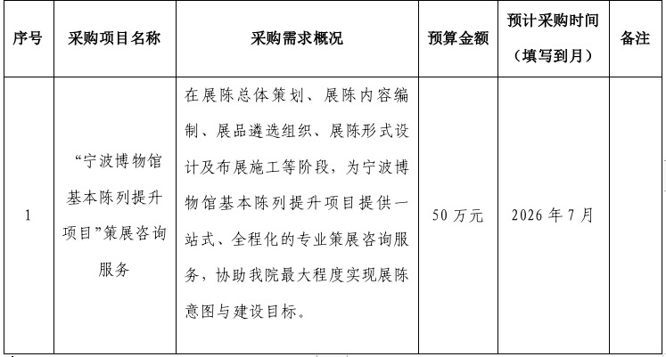 为便于供应商及时了解政府采购信息,根据《财政部关于开展政府采购意向公开工作的通知》(财库〔2020〕10号)等有关规定,现将宁波博物院2026年4月 如下: